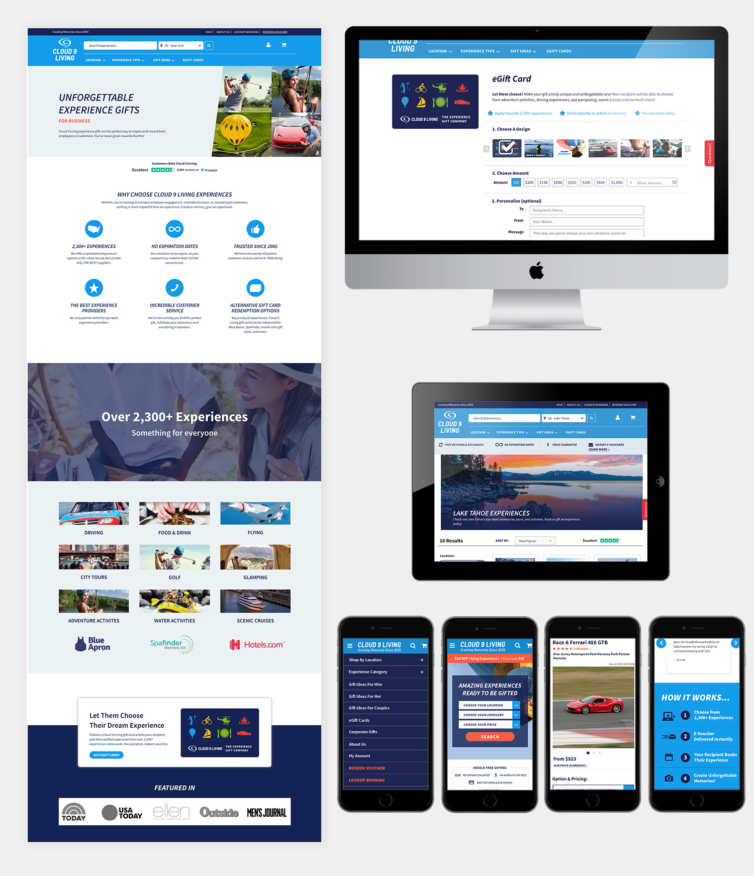 The mission at Cloud 9 Living is to create lifelong memories through amazing experiences. With over 2,500+ experiences nationwide, Cloud 9 Living is the #1 experience gift company in the United States. I served as the sole in-house designer at Cloud 9 Living for 4 years helping to dictate the creative direction of the brand. My responsibilities involved managing the user experience of the e-commerce site, and running the email marketing programs. I worked closely with the developers to make improvements to the robust website. My role also involved print work such as loyalty brochures, gift card packaging, and in-store placements for Costco and Sam’s Club.