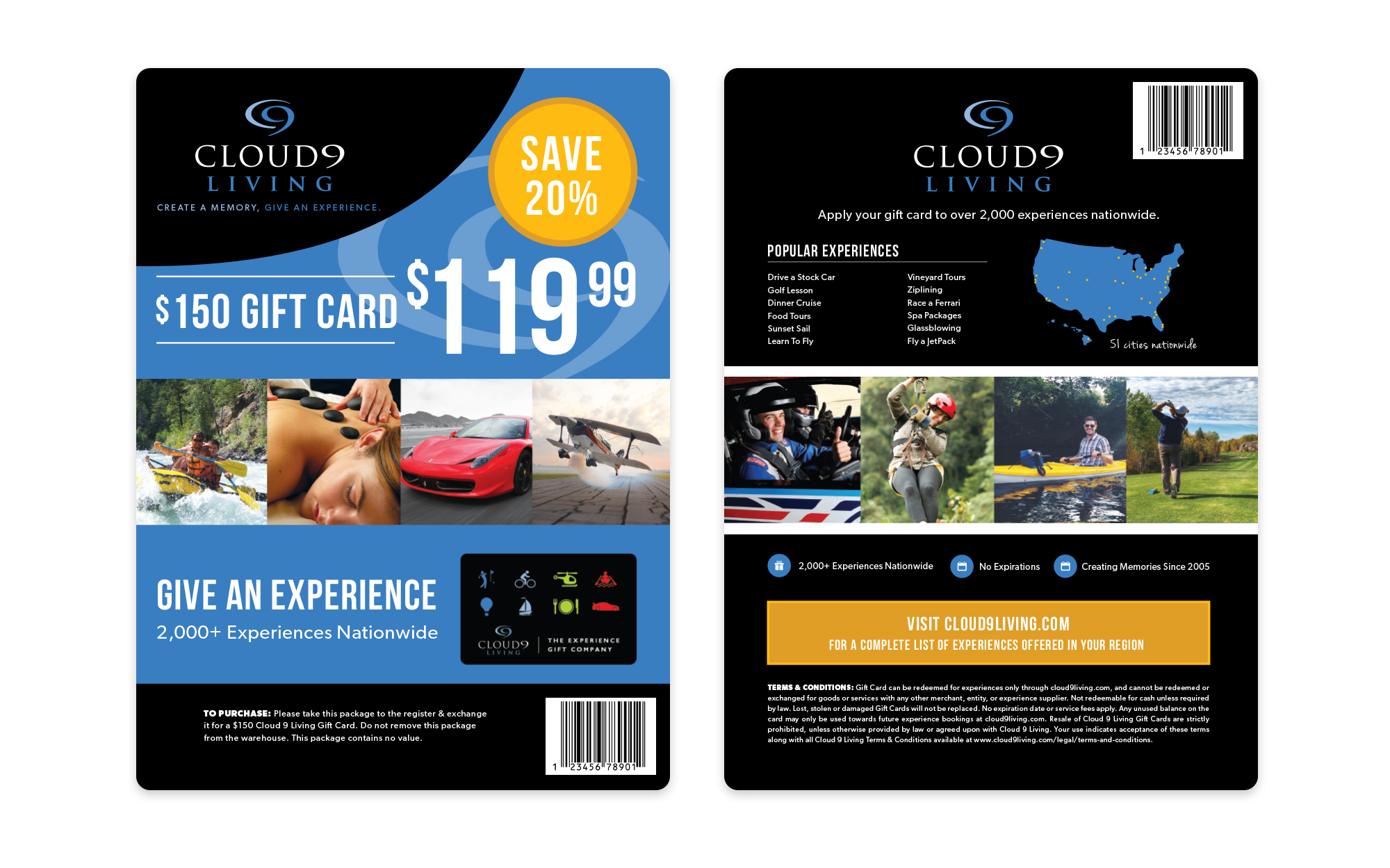 The mission at Cloud 9 Living is to create lifelong memories through amazing experiences. With over 2,500+ experiences nationwide, Cloud 9 Living is the #1 experience gift company in the United States. I served as the sole in-house designer at Cloud 9 Living for 4 years helping to dictate the creative direction of the brand. My responsibilities involved managing the user experience of the e-commerce site, and running the email marketing programs. I worked closely with the developers to make improvements to the robust website. My role also involved print work such as loyalty brochures, gift card packaging, and in-store placements for Costco and Sam’s Club.