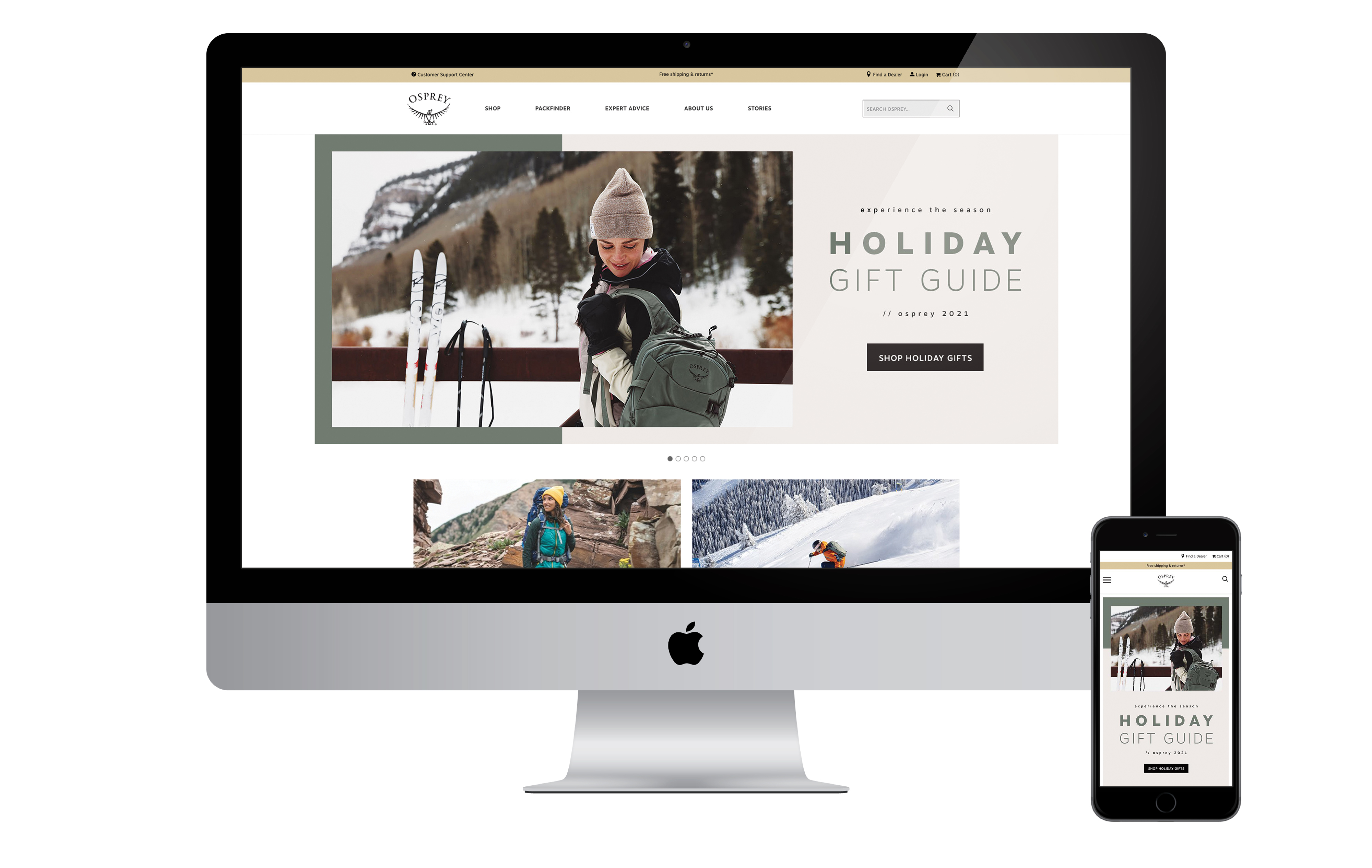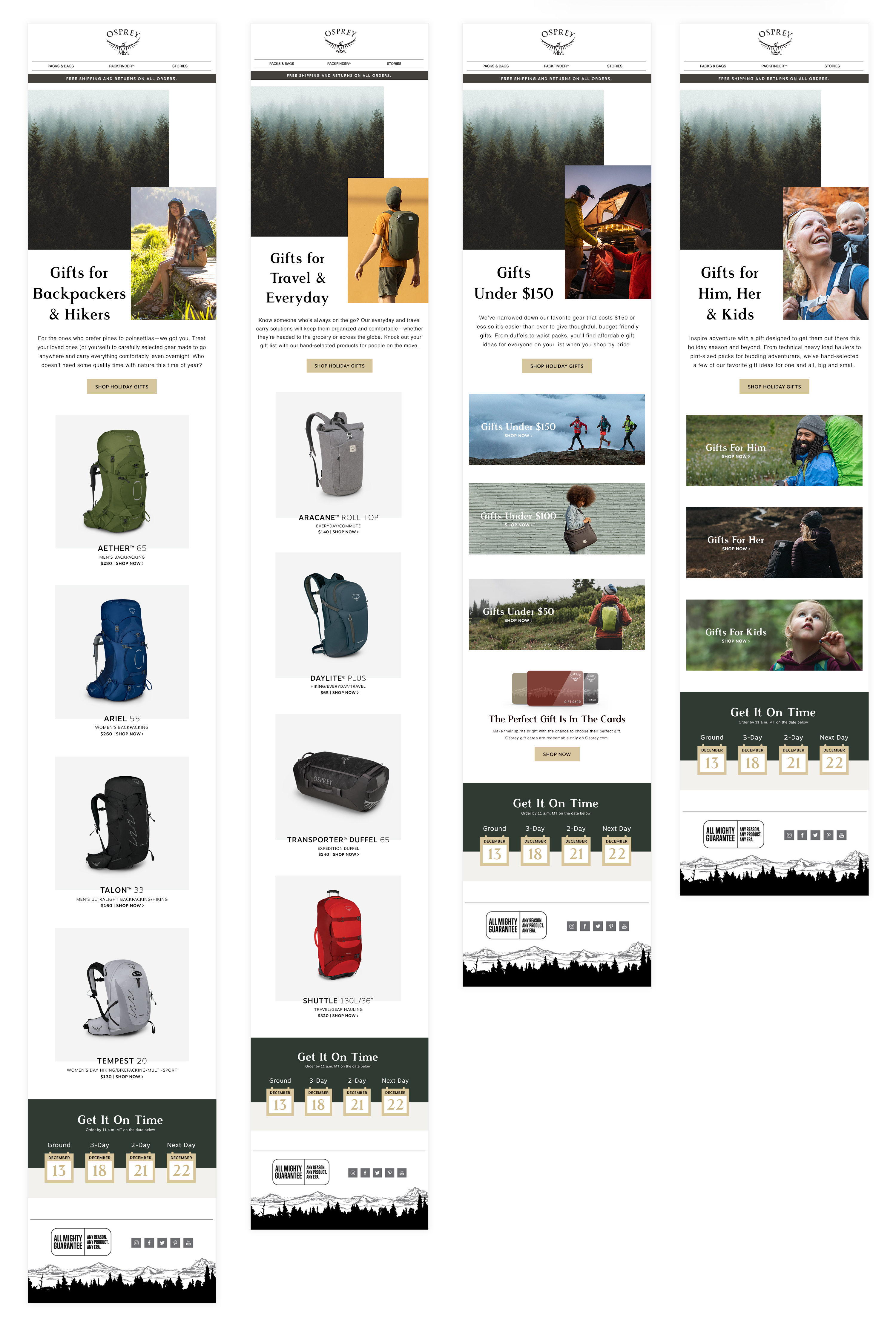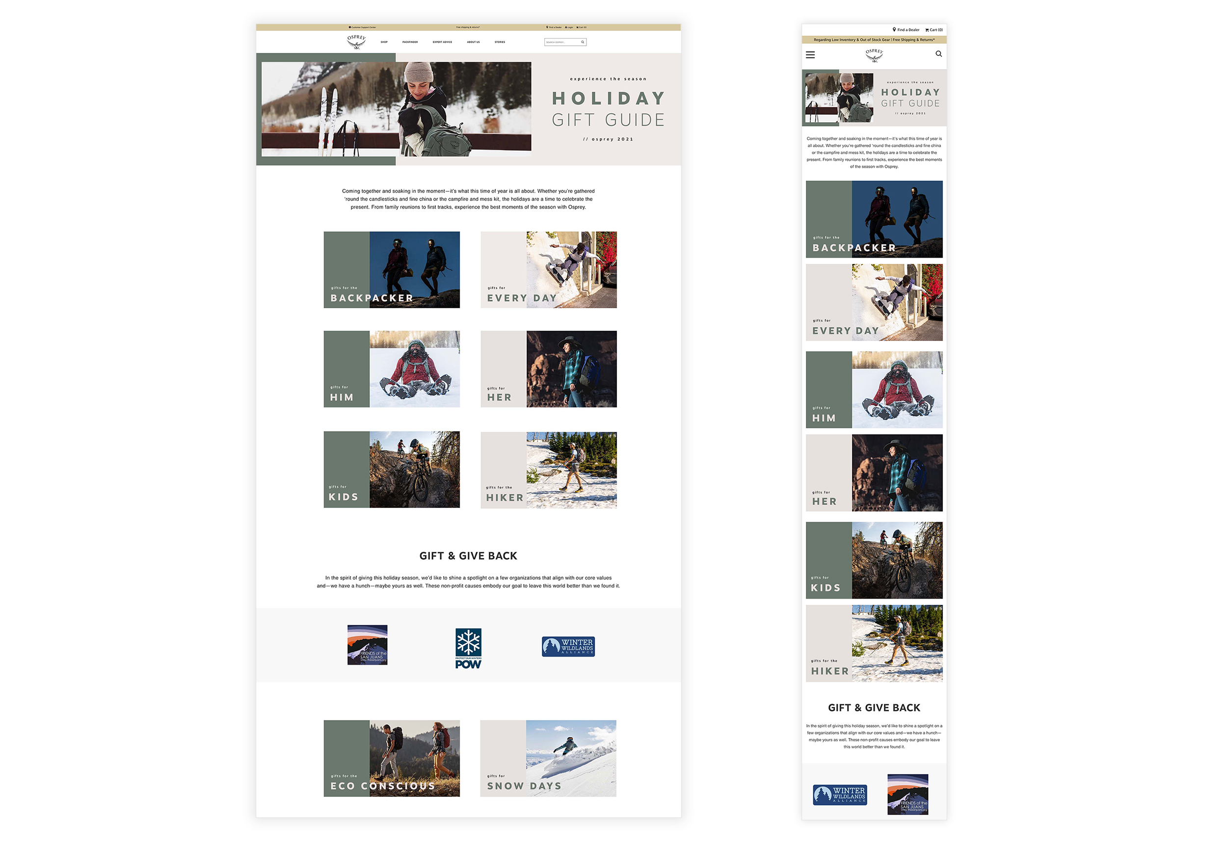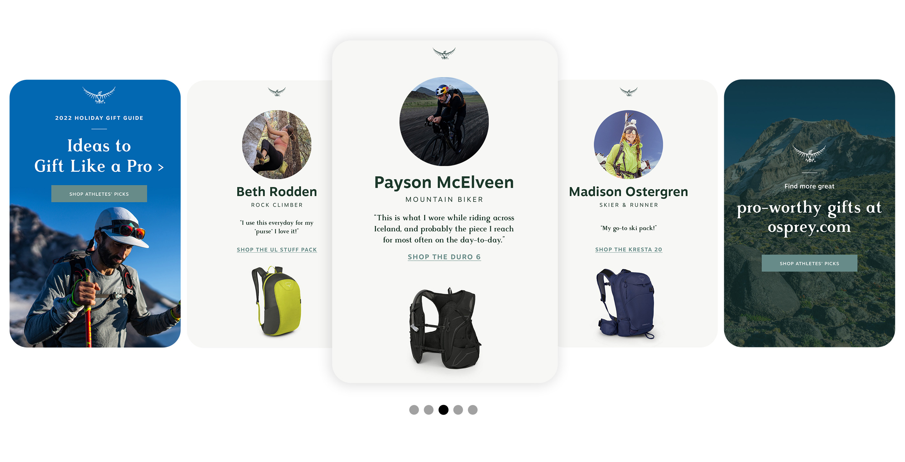 Osprey Packs Holiday Gift Guide's for the '22, '21 and '20 seasons. Copywriting: Beth Puliti