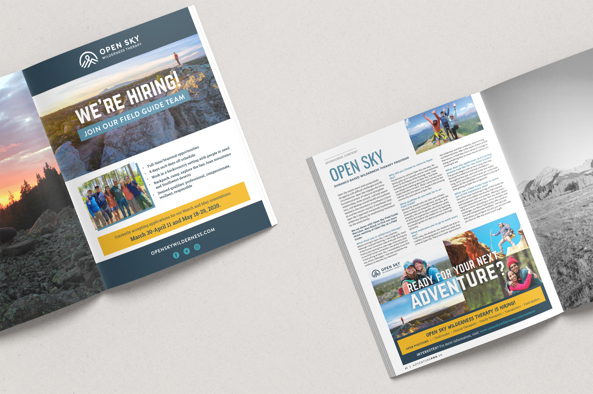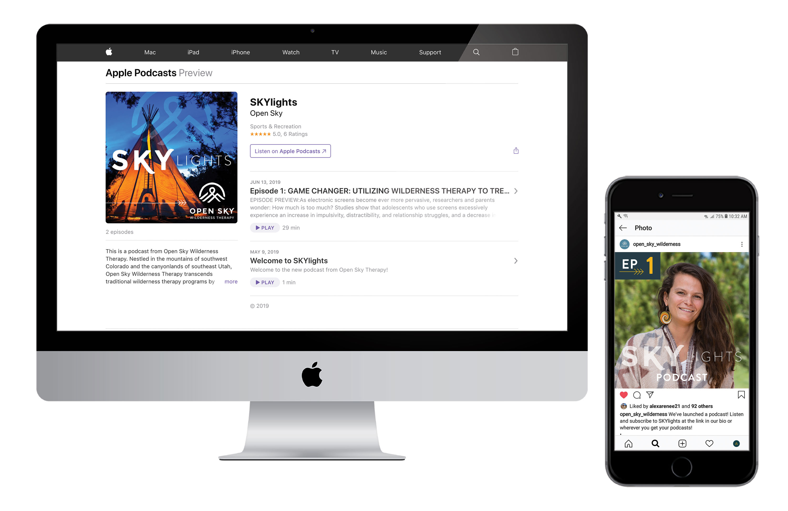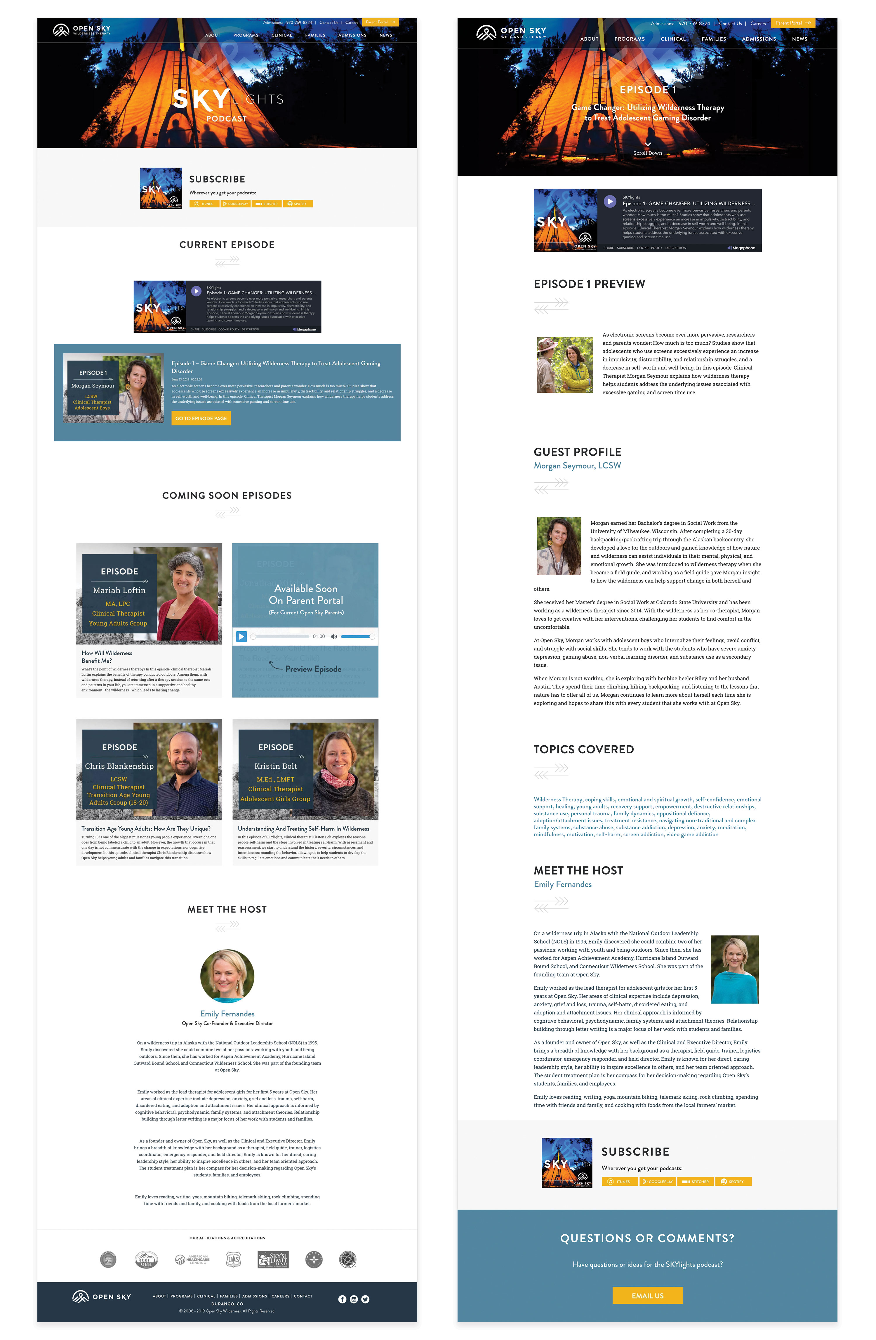 New podcast presented by Open Sky Wilderness, explores the unique value the outdoors provides on the journey toward wellness, self-discovery, and growth. My role in the process was to help with all graphics for the podcast identity. This includes the podcast cover art, the social posts, the podcast page, and any other associated imagery to support the podcast. Additionally, I've worked with Open Sky on ad designs and other marketing assets.